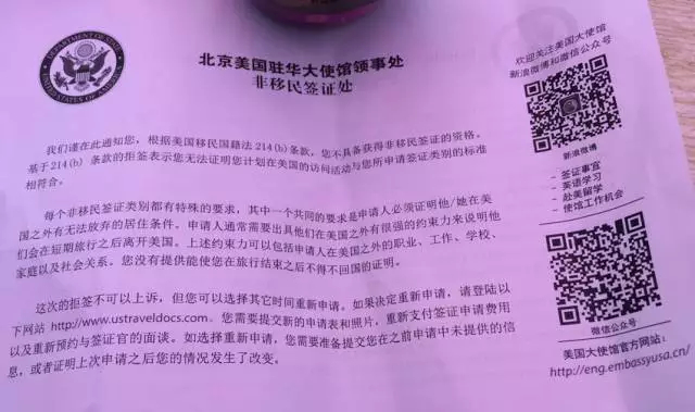 北京美国驻华大使馆出具的拒签说明