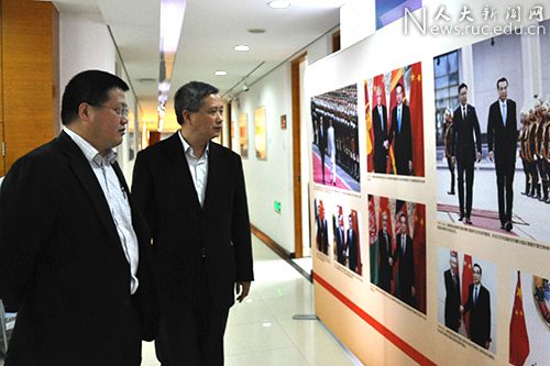 讲座开始前,中国人民大学副校长洪大用会见了姚文参赞一行,并共同观看了“2016年我国外交成果图片展”。