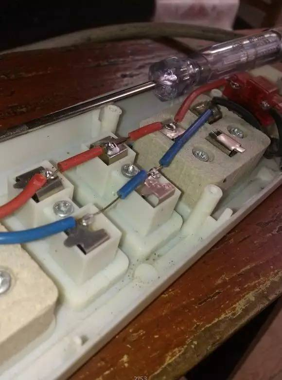 图片显示,日本排插内部,除了固定螺丝是铁的之外,其余全是一体铜片。