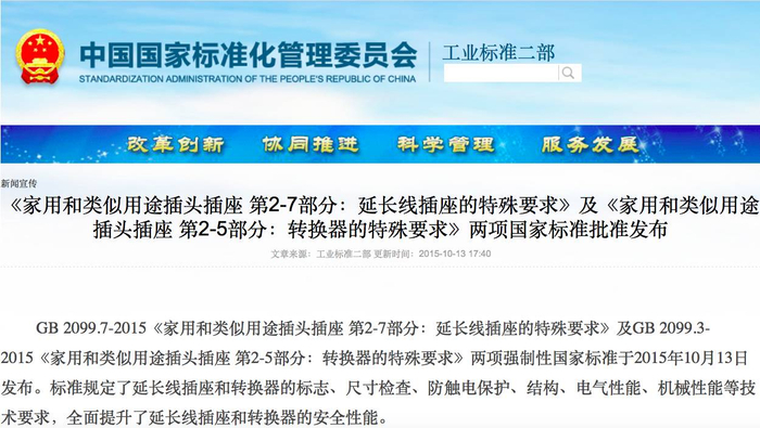 2015年10月13日,国家标准化管理委员会发布了GB 2099.7-2015《家用和类似用途插头插座 第2-7部分:延长线插座的特殊要求》及GB 2099.3-2015《家用和类似用途插头插座 第2-5部分:转换器的特殊要求》两项强制性国家标准。