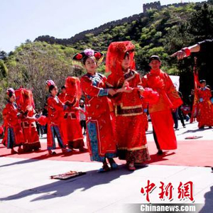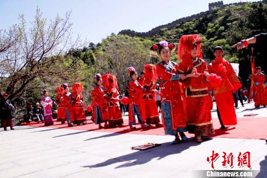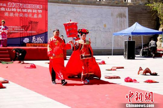 中新网承德4月23日电 (记者张帆)23日,在金山岭长城上,22对新人身着满族婚服,行满族风俗大礼,以古长城为见证,演绎传统满族婚礼庆典。
