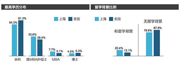 上海海归、MBA人才占比显著高于全国平均水平。数据来源:2016年《上海科创中心人才报告》