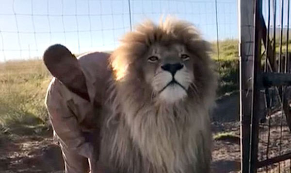 亲密无间!南非饲养员为成年雄狮做头部按摩