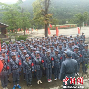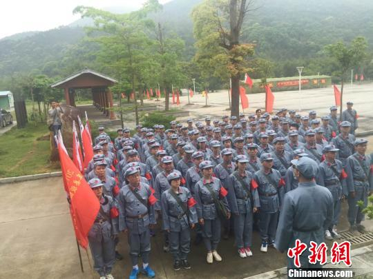 图为髙潭革命老苏区中洞纪念广场25日迎来了惠东县一批培训干部,他们全部穿红军服装,亲身体验红色文化。 宋秀杰 摄