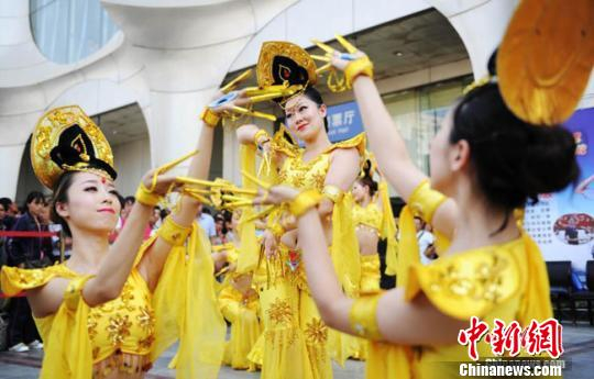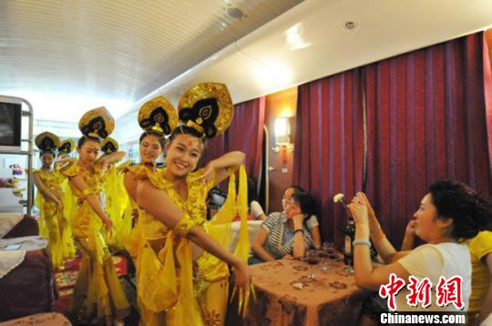 资料图。甘肃首趟“敦煌号”旅游列车从兰州始发,列车上上演的敦煌舞蹈“飞天”吸引旅客,满足游客个性化需求。 杨艳敏 摄