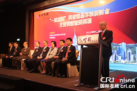国际在线报道(记者 郭胜昔、刘志敏):28日中午,为纪念香港回归20周年,由紫荆杂志社、香港基本法澳门基本法研究会、中山大学粤港澳发展研究院、香港新活力青年智库共同主办的“一国两制”与香港基本法研讨会主旨报告暨颁奖礼在香港举行。