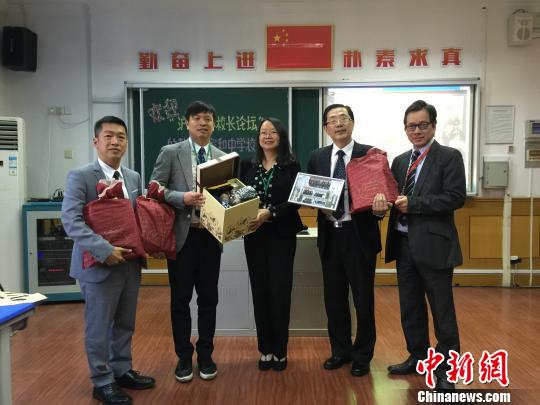 4月28日,为纪念香港回归祖国20周年,以“共享发展,传承创新”为主题的沪港中学校长论坛在上海华东师范大学开幕。图为与会的香港中学校长当天下午赴上海同济大学附属七一中学参观,并与该校师生交换纪念品。 路梅 摄