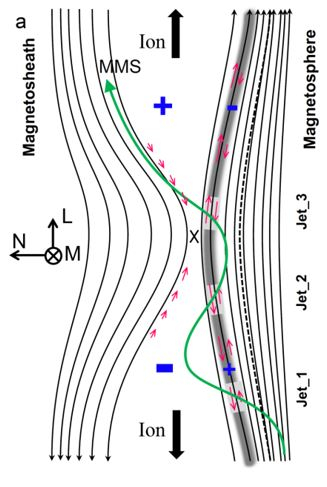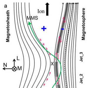 磁重联是等离子体中一种基本物理过程,它将储存的磁自由能转化为等离子体动能和热能,同时磁场的拓扑位型也会发生显著改变。空间和实验室等离子体物理中的诸多爆发现象,如太阳耀斑、磁层亚暴和托卡马克装置中的锯齿形振荡,都和磁重联有关。但是基于磁流体力学的磁重联模型预言的重联率太低,难于解释这些爆发现象所需的快速能量释放过程。目前一般认为,无碰撞磁重联提供了一种解释这些爆发现象所需快重联的可能性。而四极型霍尔磁场分布是无碰撞磁重联的一个重要特征,但通常认为这种霍尔磁场分布是离子尺度的。该文章利用MMS卫星提供的高时空分辨率的数据,首次揭示在非对称无碰撞磁重联中四极型霍尔磁场的分布可以是电子尺度的。此外,还发现在电子扩散区的边缘存在着磁能的续存过程,这对理解磁重联中的磁能释放有着重要的意义。