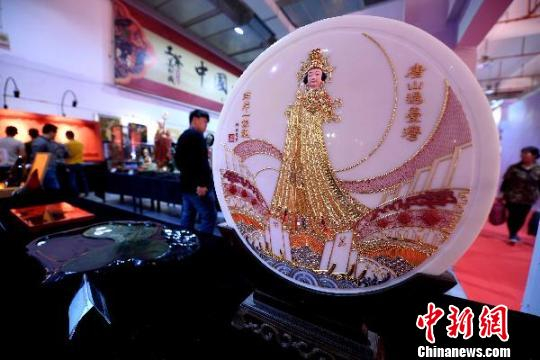 用漆线和玉石制作而成的《唐山过台湾 两岸一家亲》作品,妈祖成为艺博会最吸睛元素。 张斌 摄