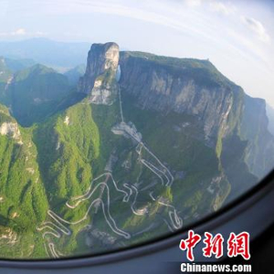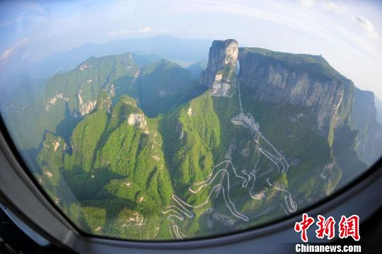 从飞机上俯瞰天门山99弯盘山公路。 邵颖 摄