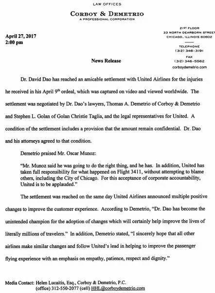事后,陶大卫雇佣了两家著名芝加哥律师事务所,起诉美联航。这两家律所中的一家专攻人身伤害案件,另一家擅长处理公司治理事务。陶大卫的其中一位代理律师是芝加哥王牌大律师德米特里奥(Thomas Demetrio),曾创下伊州最高法院中的个人伤害案赔偿金最高纪录。他在一份声明中宣布,陶大卫已经和美联航达成“友好”的和解协议。