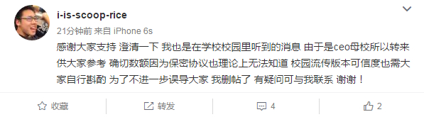 对于网传的爆料,红星新闻联系到网友@i-is-scoop-rice。该网友称,“消息并不确定属实,是校园里流传的版本,因为是CEO母校所以供大家参考”。红星新闻请他帮忙核实消息来源,他表示,“口口相传,很难核实”。鉴于关注度太高,该网友随后删帖,还在微博上发布了声明。
