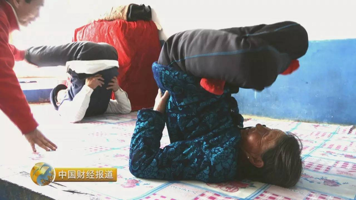 许富和武启莲练的是双人瑜伽的一些动作,难度非常大。它不但考验老人的身体状况,更考验老两口配合的默契程度。