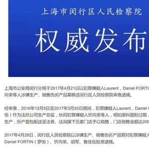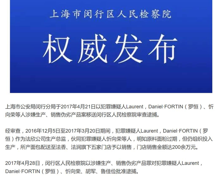 4月28日,上海市闵行区人民检察院发布消息称,以涉嫌生产、销售伪劣产品罪对犯罪嫌疑人Laurent,Daniel·FORTIN(罗恒)、忻向荣、胡军、鲁佳俭批准逮捕,其中,罗恒为法欣公司生产总监。闵行区人民检察院称,罗恒伙同犯罪嫌疑人忻向荣等人,明知原料面粉过期,但仍组织投入生产,所产面包配送至法香、法润旗下五家门店予以销售,门店销售金额达200余万元。