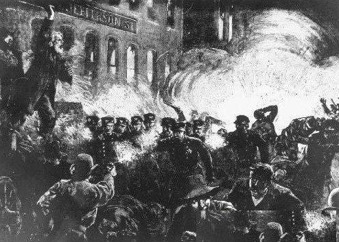 1886年5月1日,美国芝加哥等城爆发大规模抗争游行,聚集约35万人,要求落实8小时工时制度,并改善厂房与工作条件。市府派出大批警力维安,却因激烈冲突造成双方互有死伤,更在3天后的群众大会上,遭受炸弹攻击,造成多名警察和劳工当场死亡,史称“干草市场暴乱”(Haymarket Riot)。而后有多名工会领袖遭判死刑。