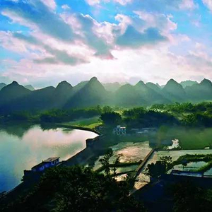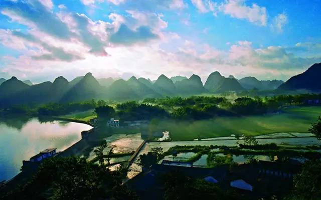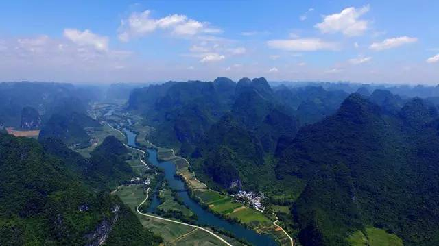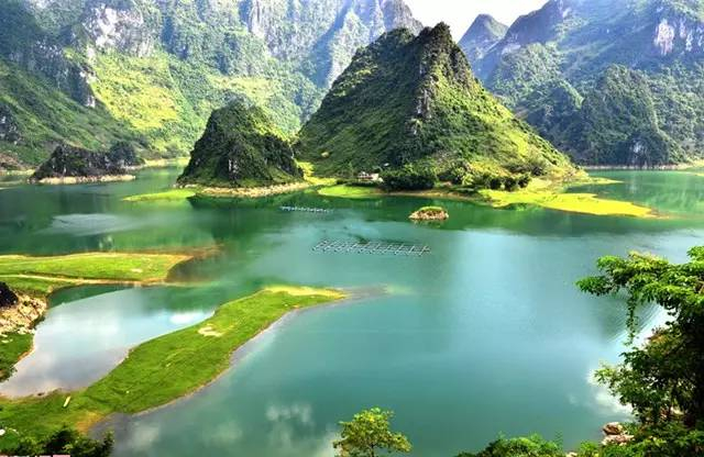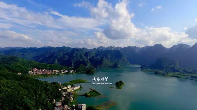 坡豪湖与红水河连接,湖水晶莹如镜,清净如玉,两岸峰峦叠翠,翠竹依依,极目远眺,湖色与天光争辉,绿水共青天斗碧,与岸边的田野村庄融为一体,恰似一幅绝美山水画。