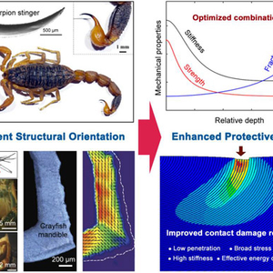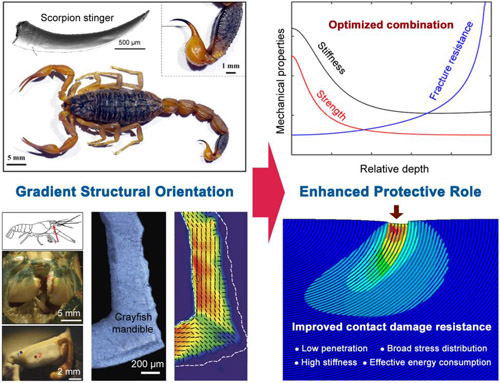 图1. 天然生物材料通过梯度结构取向实现局域力学性能的优化分布与匹配,从而提高了材料的接触损伤抗力