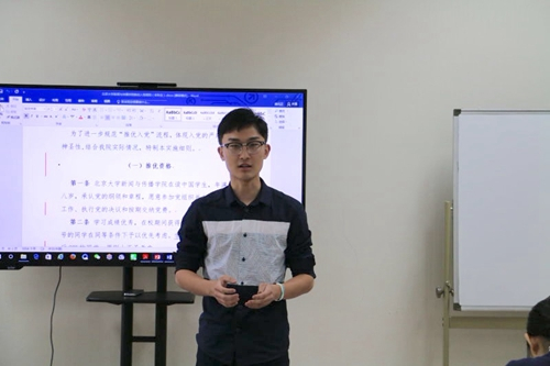 张泽钰认为,申请加入中国共产党能够鞭策自己不断进步,也能实现自己帮助他人、服务社会的愿望;徐元正则向大家分享了在中国人民解放军空军长春飞行学院进行学习交流的收获,认为党员要具备“以天下为己任”的家国情怀;何丽琼从电视剧《人民的名义》谈起,讲述了自己对党性的具体认识;郑江浩则联系自身的生活实际,表达了对党和国家的感恩之情,他说:“我能够进入北京大学读书,而且家庭条件能够有所改善,归根到底都离不开党和国家的政策支持。”大家的发言严肃又不失真诚,赢得现场阵阵掌声。