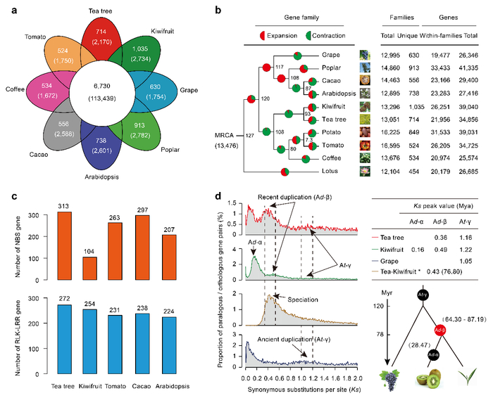 研究表明,茶树基因组中重复序列含量极高,约占整个基因组的80.9%;在过去的5,000万年以来,茶树基因组中长末端重复序列反转录转座子家族经历了多次大量的爆发,加上它们长期而缓慢地扩增但缺少有效的DNA删除机制,导致茶树基因组变得十分庞大;研究发现最大的长末端重复序列反转录转座子家族约占茶树基因组的36.79%,这是单个长末端重复序列反转录转座子家族在植物基因组里扩张和生存长达5,000万年的首次报道。研究还发现,茶树近期曾经发生过一次全基因组重复事件;茶树基因组里与茶叶的香气、风味与品质密切相关的诸如黄酮、萜类等生物合成相关的基因家族显著地扩增;除了参与黄酮和萜类生物合成的基因家族的大量扩增可以促进茶树环境适应性以外,发现强烈的自然选择促进了茶树抵抗生物和非生物逆境的抗病基因家族的大量增长,诠释了为什么茶树可以在全球扩散并广泛地种植在亚洲、非洲、欧洲、北美、南美和大洋洲的不同气候条件下的多样化生境中而成为世界性的饮料植物。