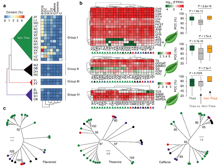 茶树所在的山茶属植物多达119种,一个重要但长期困惑的问题是为什么只是茶组植物的叶子适合制茶而非茶组植物诸如我们熟知的茶花、油茶和金花茶等的叶片不作为茶饮。研究团队对大多数茶组植物和非茶组的代表植物共25个山茶属物种中决定茶叶适制性和品质的三个主要的特征性成分(儿茶素或茶多酚、茶氨酸和咖啡因)进行了植物化学成分比较分析,发现茶树和其它的茶组植物富含茶多酚和咖啡因而区别于非茶组物种,比如茶多酚中的特征性成分(EGCG,EGC,C,EC 和 ECG)的含量在茶组物种之间差别很大但显著地高于非茶组物种,而茶氨酸含量没有显著差别,说明高含量的茶多酚和咖啡因决定了山茶属植物能否适合制茶和茶叶风味。基于茶树基因组里获得的与茶多酚、茶氨酸和咖啡因生物合成相关的基因序列,研究团队中的比较基因组学研究发现茶组与非茶组物种共同地拥有与茶叶特征性成分生物合成相关的基因,说明了茶树的三大特征性成分的生物合成途径约在6.3百万年前在山茶属植物的共同祖先里就已形成并且高度保守至今。