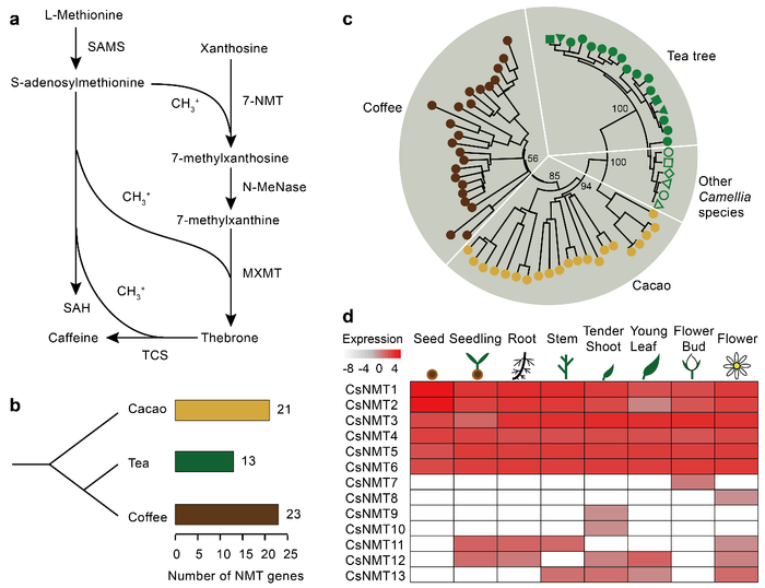 通过三大饮料植物的比较基因组学分析发现,相对于咖啡,咖啡因生物合成途径在茶树和可可中发生了独立的进化,这与咖啡基因组报道的咖啡因生物合成途径的协同进化的发现明显有别。进一步分析发现,茶树和其它山茶属植物的咖啡因生物合成途径可能起源于可可但是后来经历了独立的进化,首次证实了茶树咖啡因生物合成途径的近期发生了快速而独立的进化。