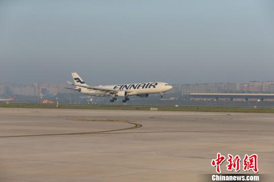 图为5月4日,由赫尔辛基起飞的芬兰航空A330客机抵达重庆江北国际机场。这标志着停航4个月的重庆至赫尔辛基航线正式复航。 钟欣 摄