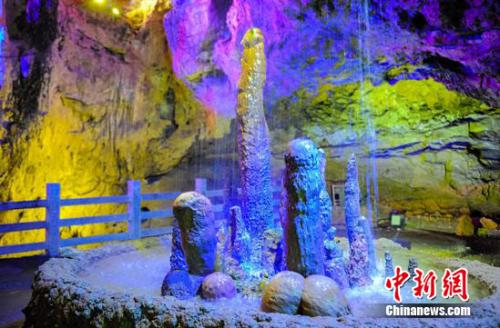 据传,太古洞为古代桃花源人家躲避官方搜捕的最后藏身之地。图为灯饰点缀的太古洞。