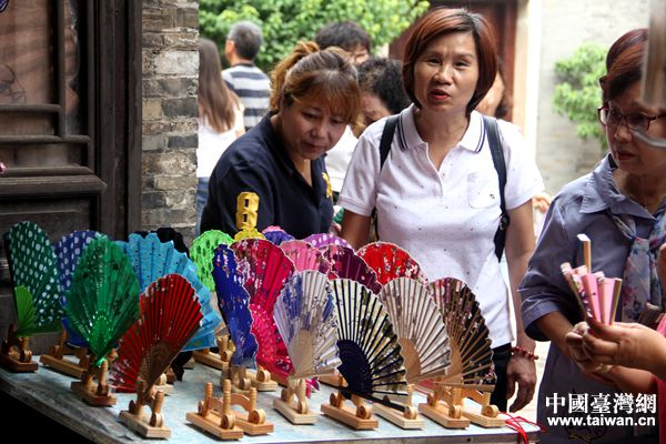 一家小店销售的绢纱上画泥金花朵折扇吸引了交流团台湾客人的兴趣,很多人都买了一把。(中国台湾网 李杰 摄)