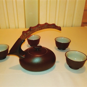 参赛作品中的一套茶具,其陶瓷壶的提把手是用北山羊羊角做成的 石承烈摄