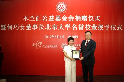 2017年5月4日,木兰汇公益基金会捐赠仪式暨何巧女董事长北京大学名誉校董授予仪式在北京大学国家发展研究院万众楼二层隆重举行。北京大学党委书记郝平、校长林建华、副校长李岩松,北京大学教育基金会理事长朱善璐、秘书长邓娅,北京大学国家发展研究院党委书记胡大源、院长姚洋、副院长徐晋涛、副院长余淼杰等领导出席了此次活动。