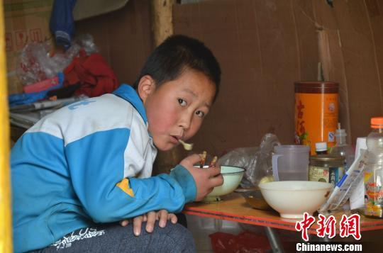 “陪读家长”田亚平习惯把第一碗饭先送到上学的孩子手里,再照顾其他人。 冯志军 摄