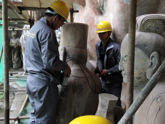 陈卉丽是修复千手观音和此次卧佛修复的专家之一,她经常把自己比作“全科医生”。她说,除了肉眼观察石刻的显见“外伤”之外,还要通过各种仪器对石刻的“内伤”进行勘测,然后开出“药方”,专家们再进行论证等。