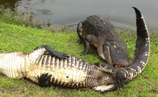 只见这两只鳄鱼躺在草坪上,拼命地摆动尾巴,冲着彼此的下颚撕咬,并时不时地在地上翻滚。在这个过程中,一方的牙齿被打掉,另一方也伤痕累累。最后,两只鳄鱼的身上都被扯开了口子,不停地流血。一只转身走开,另一只则滑入水中,无法动弹。