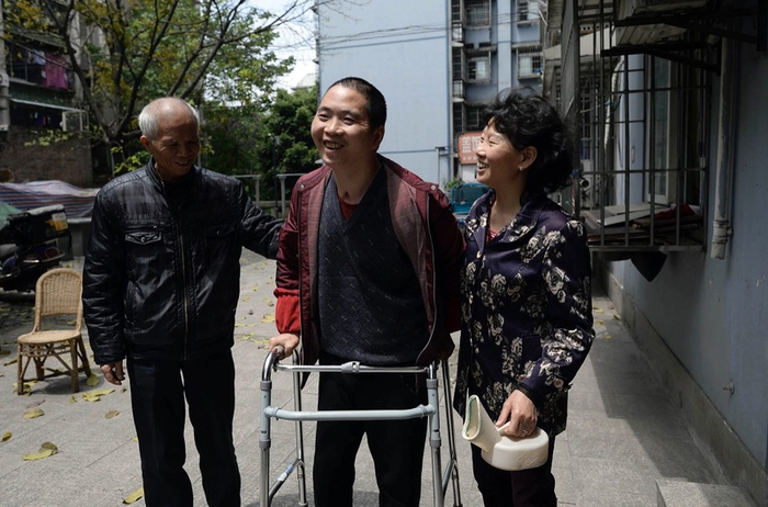 在父母陪伴下,儿子锻炼到下午3时,开始往家挪步。