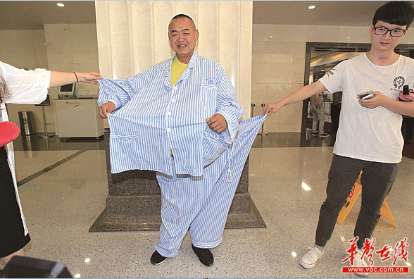 5月11日,瘦了90公斤的曾先生再穿上手术前的病号服,已经有大半的“空余”。