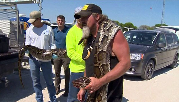 克拉姆正在参加佛罗里达州水资源管理局3月份开始实施的蟒蛇清除计划,之前他已捕获过几条蛇,但这次是他捕获的最大的一条。他趁巨蟒经过大沼泽地时与其展开搏斗并成功将其捕获。之后,他还剖开巨蟒腹部,从中取出了78颗蛇蛋。