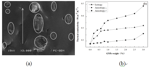 (a)石墨烯在强磁场下取向形成各向异性结构,图中箭头表示磁场方向;(b)石墨烯/PDMS热导率与石墨烯质量分数和结构的关系。Isotropic代表各向同性试样热导率,Anistropic∥代表平行于磁场方向的热导率,Anisotropic⊥表示垂直于磁场方向的热导率。