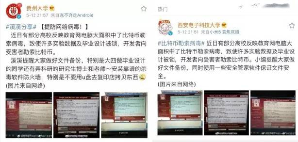 值得注意的是,国内多所高校受到了此次网络攻击的影响。据中国青年网,近日正值毕业论文季,这种病毒在国内一些高校的教育网、校园网已经造成了影响,致使许多实验室数据和毕业设计被锁。昨夜今晨包括山东大学、南昌大学、广西师范大学、东北财经大学在内十几家高校发布通知,提醒师生注意防范。