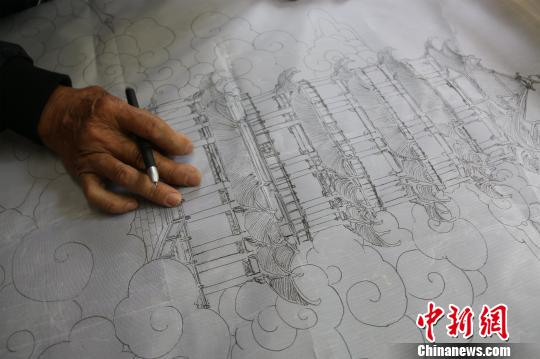 陈士荣正在风筝布上精心绘制黄鹤楼图样 梁婷 摄