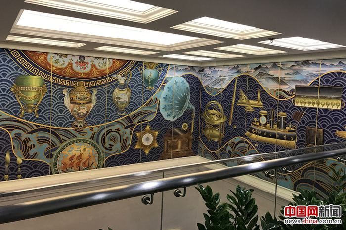 故宫鼓浪屿外国文物馆馆内描绘“海上丝绸之路”和西洋文物的巨幅掐丝珐琅画。 摄影 中国网 苏向东