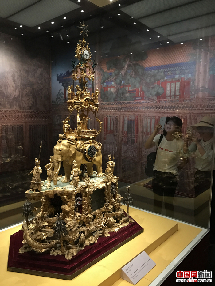 观众观赏故宫鼓浪屿外国文物馆“镇馆之宝”——18世纪的英国铜镀金象驮转花钟。 摄影 中国网 苏向东