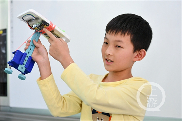 “我的奶奶年纪大,腿脚和眼睛都不好,出门有时候会摔跤,所以我设计了一个智能拐杖。它用了光敏LED、循迹模块、电池盒、杜邦线等材料。当循迹模块感应到拐杖前方有障碍物时,拐杖就会震动,提醒使用者;天黑了,光敏LED也会自动亮起。老年人、残疾人和野外探险都可以使用。”万州区沙河小学的王语琦同学介绍说。