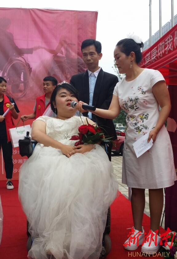 新婚宣誓、相互表白、抛绣球、赠送新婚礼物……婚礼现场,身穿礼服、婚纱的新郎新娘们露出幸福的笑容。“其实我们之中有的夫妻已不是新婚,但由于身体残疾等客观原因,都没有正式举办过婚礼。”新娘龚莹从出生起就无法行走,她和有轻度肢体残疾的丈夫邹安乐通过征婚网站相识,并于2015年元旦步入婚姻殿堂,当时双方父母坐在一起简单地吃了顿饭就算是婚礼了,穿婚纱是她多年来的一个梦。“我们残疾人夫妻走到一起非常不容易,一场普通的婚礼对我们来说都是一种奢求,很感谢政府和爱心人士的帮助。”她感动落泪。