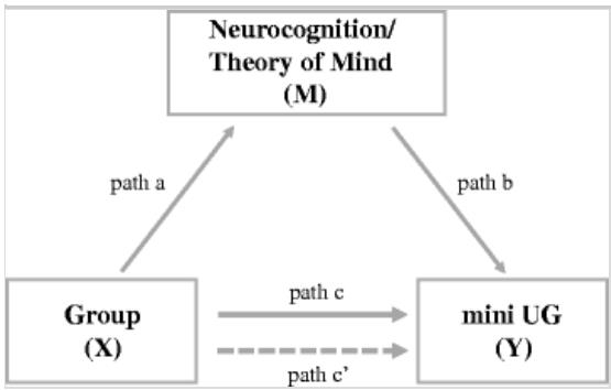 图1 心理理论(ToM)或认知神经功能对迷你最后通牒行为(mini UG)中介效应的中介分析示意图