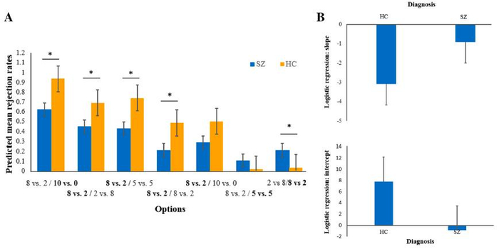 图2(A)miniUG范式中被试对分配方案的拒绝率;(B)被试拒绝率受分配情境影响的二元逻辑回归分析结果