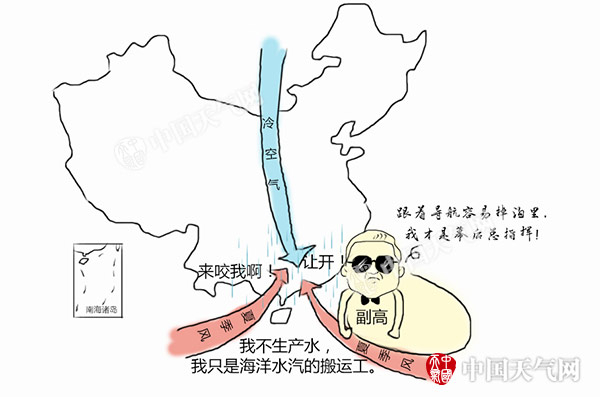 副高是一个巨大的暖性高压系统,副高控制区域之内,多高温炎热天气。在夏半年,太阳在北半球的直射点逐渐向北移动,副高也随之增强并随之北移。4月,副热带高压从赤道附近北移至南海,副高北部边缘正好位于华南沿海上空。冷空气到达华南上空时,被副高挡住去路。由于副高太过强大,冷、暖空气很难攻破其堡垒,只是被挡在副高外围转悠。于是,二者迎头碰上,谁也不服谁,华南前汛期就此拉开大幕。