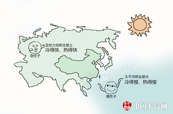 季风气候和我国独特的地理位置有关。中国位于世界最大的陆地——欧亚大陆,紧挨着世界上最大的大洋——太平洋。陆地是个急脾气,给点阳光就灿烂,冷得快,热得也快;水则是是个慢性子,冷的慢,热的也慢。