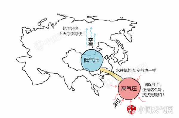 夏天,陆地热的快,地面空气受热膨胀后“跑到”了天上,相当于地面空气“缺失”了一大块,所以形成了低气压。而海洋热得慢,所以海面相对陆地比较冷,热胀冷缩,空气压缩“下坠”聚集在一起,形成高气压。水往低处流,空气也一样,从高处流向低处就形成了风。夏季风就是从海洋吹向陆地的风,携带了大量水汽。