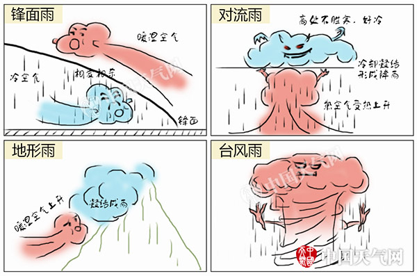 龙舟水当然不是神仙在倒洗澡水啦!每年端午节前后一个月间,广东、广西、福建、海南,也就是华南地区,隔三差五就会下一场滂沱大雨,因为临近端午节,所以被称为龙舟水。为什么会下雨?为什么端午前后雨这么猛?估计要写一本书才能说清楚。化繁为简,首先说说为什么会下雨,我国的降雨主要有这四种类型。