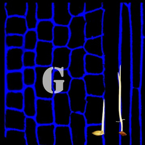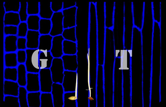 图:GY1基因的等位变异GY1376T与长中胚轴相关。左侧:对照日本晴品种,含有对照GY1376G,具有短中胚轴和胚芽鞘,蓝色荧光显示细胞较短。右侧:Kasalath品种,含有优异等位变异GY1376T,具有长中胚轴和胚芽鞘,蓝色荧光显示细胞较长。